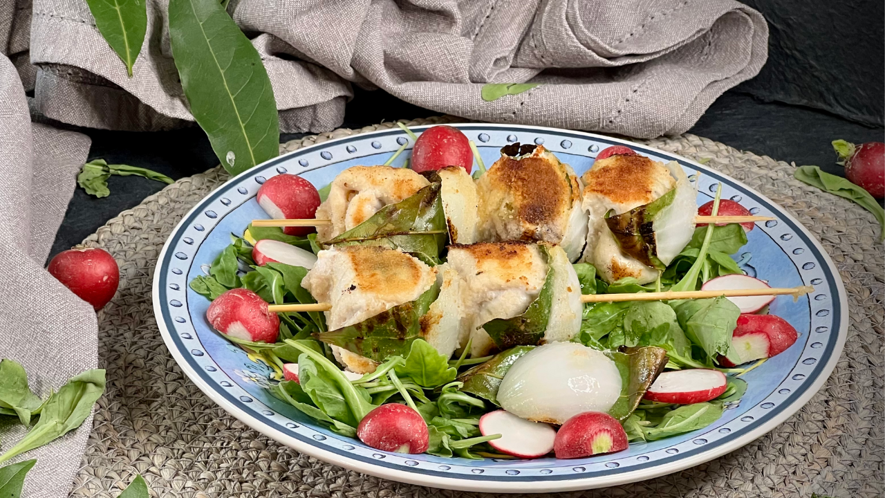 - Ungete gli involtini di pesce spada con un po' d'olio e giratele da tutti i lati nella farcia rimasta. Per finire prendete quattro spiedini di legno e infilzatevi quattro involtini ciascuno separati da un pezzetto di cipolla e una foglia di alloro.