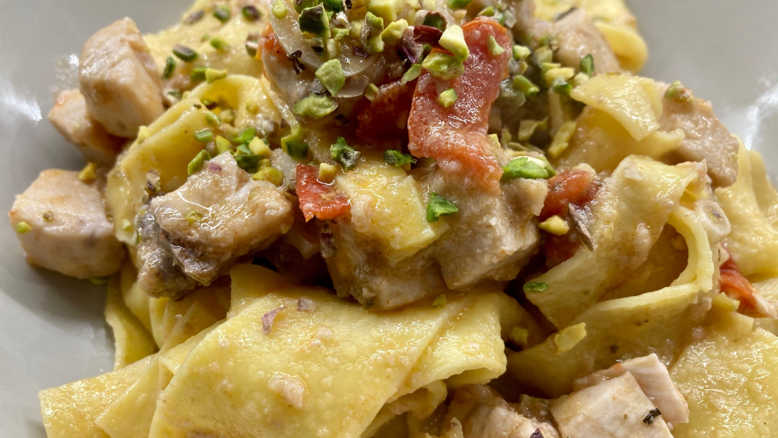 - Scolate la pasta ben al dente direttamente nel sugo e saltatela insieme al condimento, aggiungendo per ultimo la granella di pistacchio, prima di servirla.Buon appetito.